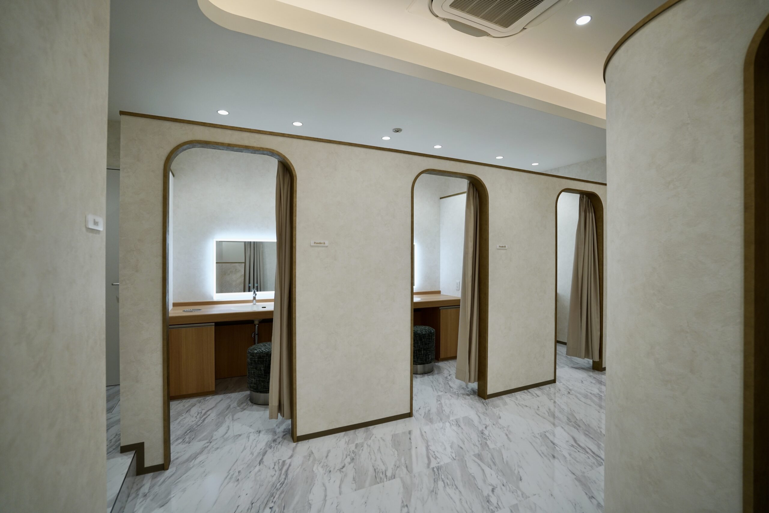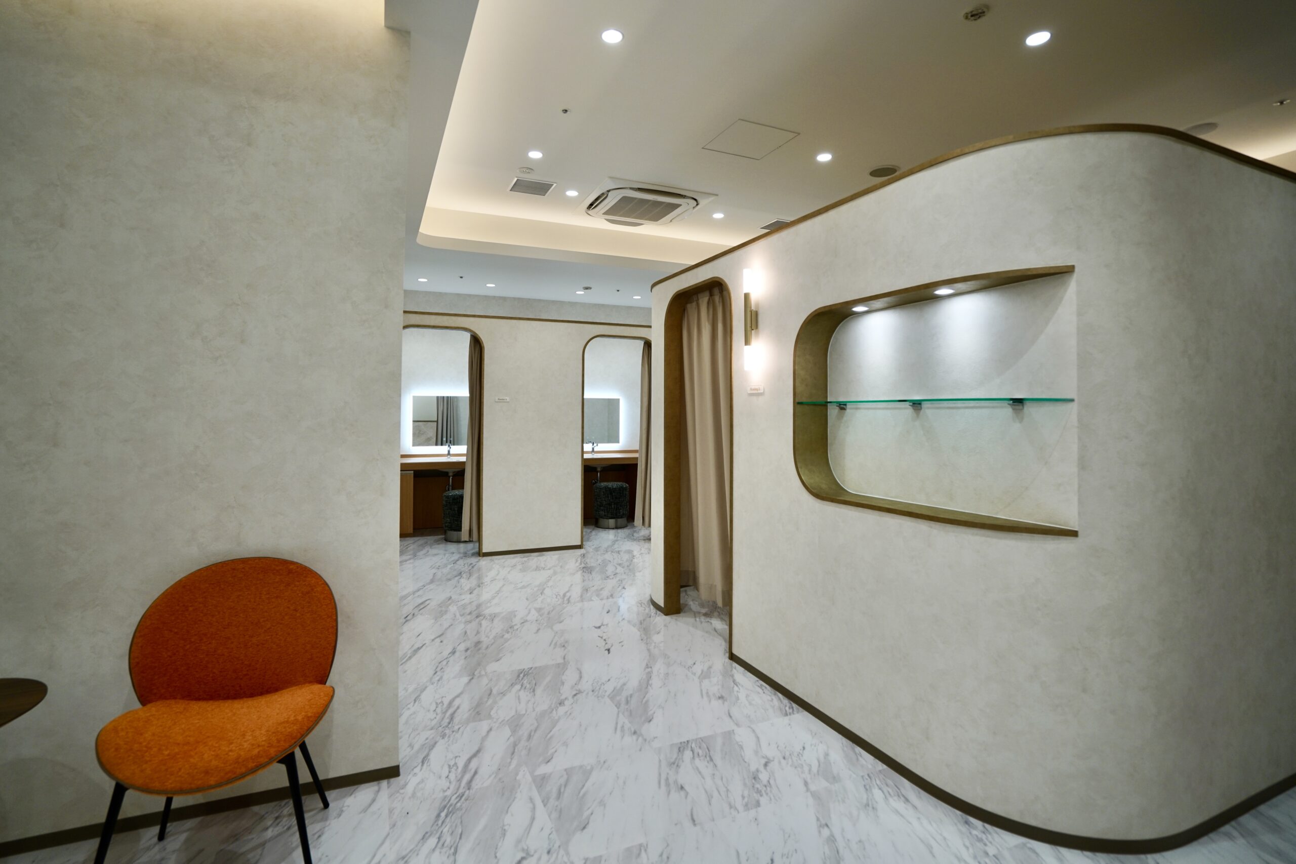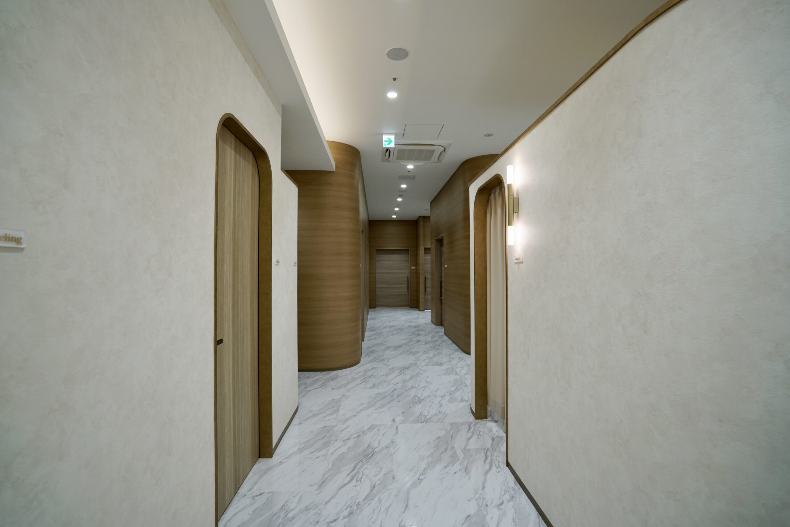 大理石調のフロアやレセプションカウンター、間接照明を効果的に配した白い壁面や曲面と柔らかな色彩、ナチュラルシックなマテリアルがホテルのような上質感と清潔感を演出。クリニックを訪れる患者様が持つ不安を和らげ、単なる医療機関ではなく訪れるたびに美意識が高まり、心身ともに非日常的なリラクゼーションを体感できる空間を実現しました。